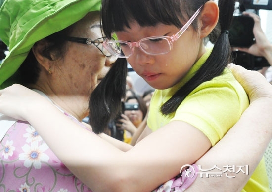 [천지일보=김예슬 기자] 6일 오후 서울 종로구 중학동 주한일본대사관 앞에서 ‘제1138차 일본군 위안부 문제 해결을 위한 정기 수요집회’가 열린 가운데 한 초등학생이 눈물을 흘리며 위안부 피해 할머니와 포옹하고 있다.