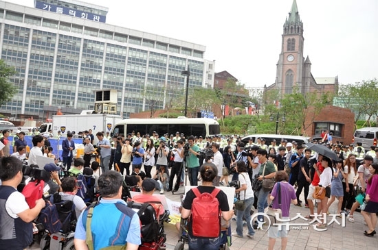 이날 명동성당 앞길은 시위에 나선 연대 소속 회원들과 취재기자들, 경찰, 지나가는 시민과 차량 등으로 혼잡을 빚었다.