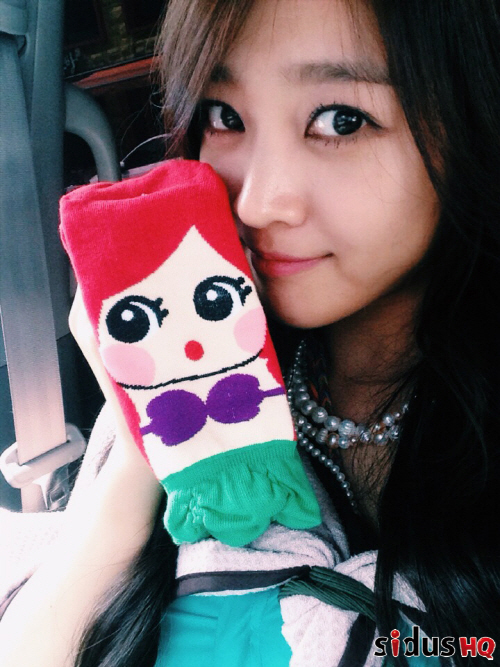 사진 속 조보아는 자신의 모습을 캐릭터한 인어공주 양말을 들고 귀엽게 미소를 띄고 있다.