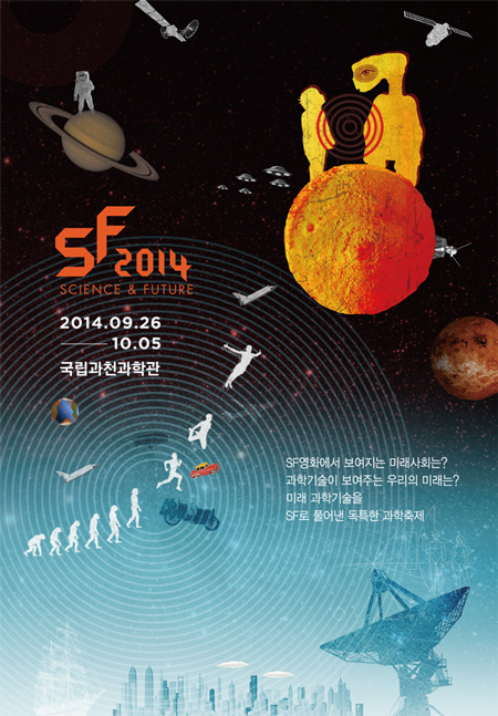 올해 SF2014, Science&Future 축제는 다음 달 26일부터 10월 5일까지 9일간 국립과천과학관에서 펼쳐진다. 이번 행사는 2010 과천국제SF영상축제에서 출발해 올해로 다섯 돌을 맞이한 국립과천과학관의 브랜드 축제다. 특히 올해부터 축제 명칭을 ‘SF2014’로 변경하여 과학을 기반으로 한 SF축제로서의 인문과학적 색깔을 분명히 보여주고 있다.