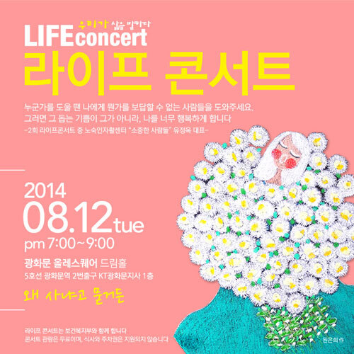 이번 라이프 콘서트는 ‘왜 사냐고 묻거든’이라는 주제로 삶과 생명의 소중함을 나누고 건강한 삶의 생명력을 전하는 TED 형식의 토크 콘서트다. 연사들은 누군가를 돕는 과정과 그로 인해 바뀐 자신의 삶을 대하는 태도와 마음을 전할 예정이다.