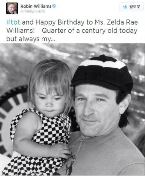 로빈스 윌리엄스는 지난달 31일 인스타그램에 “젤다 윌리엄스 생일 축하해. 오늘 25세가 됐지만 내겐 항상 꼬마 아가씨야. 생일 축하해. 사랑한다 젤다 윌리엄스”라는 글을 게재했다.
