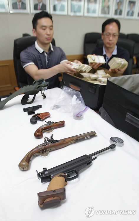 앞서 검찰은 최근 김 씨 언니의 수도권 소재 자택을 압수수색해 2, 3, 6, 7번 띠지가 붙어 있는 가방 5개를 발견했다. 그 중 2번과 7번 가방에서 15억 원을 찾아냈다. 7번 가방에서는 권총 5정이 나왔다.