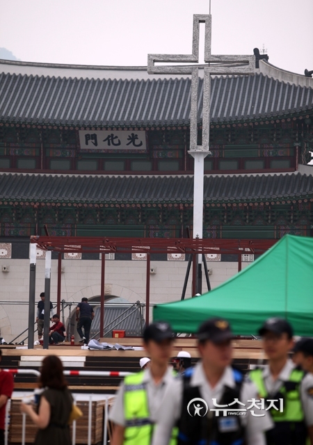 [천지일보=박준성 기자] 프란치스코 교황 방한을 하루 앞둔 13일 오후 서울 광화문 일대에서 시복식을 위한 시설물이 설치되고 있다. 16일 오전 10시부터 광화문광장에서 열리는 프란치스코 교황 시복식 행사로 광화문 일대는 15일 밤 7시부터 정부중앙청사 사거리에서 경복궁 사거리(동십자각 앞), 광화문 삼거리에서 세종대로 사거리 구간의 교통통제가 시작된다.