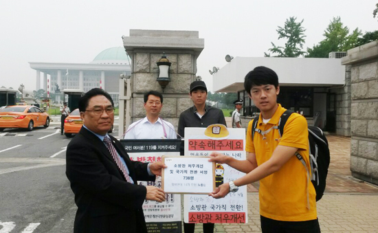 참여연대 인턴 대학생들은 13일 국회 앞에서 1인 시위 중인 최기용 소국본(소방관처우개선국민운동본부) 상임대표에게 소방관 처우개선 및 국가직화를 요구하는 700여 명의 서명을 전달했다. 이 서명은 지난 8일 서울시 마포구 홍대 걷고싶은거리에서 받은 것이다.