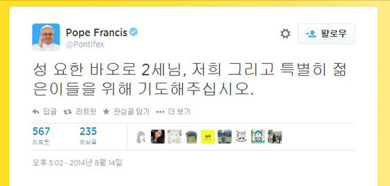 - [교황방한] 프란치스코 교황 방한 후 첫 트위터 “노년층‧젊은이” 언급