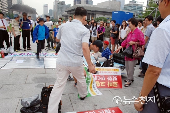 [천지일보=정현경 기자] 프란치스코 교황의 방한을 맞아 16일 치러질 ‘윤지충 바오로와 동료 123위 시복식’을 위한 준비작업이 광화문광장 일대에서 착착 진행되고 있는 가운데, 일부 개신교인들이 교황을 반대하는 예배를 가져 물의를 일으켰다.