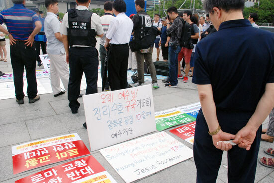 [천지일보=정현경 기자] 프란치스코 교황의 방한을 맞아 16일 치러질 ‘윤지충 바오로와 동료 123위 시복식’을 위한 준비작업이 광화문광장 일대에서 착착 진행되고 있는 가운데, 일부 개신교인들이 교황을 반대하는 예배를 가져 물의를 일으켰다.