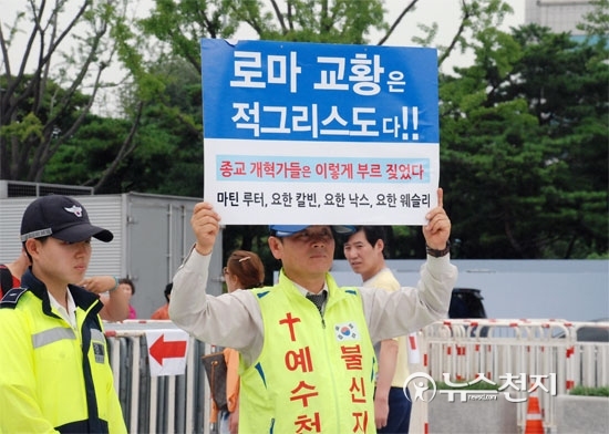 [천지일보=정현경 기자] 프란치스코 교황의 방한을 맞아 16일 치러질 ‘윤지충 바오로와 동료 123위 시복식’을 위한 준비작업이 광화문광장 일대에서 착착 진행되고 있는 가운데, 일부 개신교인들이 교황을 반대하는 예배를 가져 물의를 일으켰다.