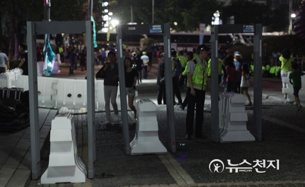 [천지일보=박준성 기자] 윤지충 바오르와 동료 순교자 123위 시복식(16일)이 열리는 서울 광화문광장 일대 경비는 삼엄할 정도다. 경찰은 시복식을 하루 앞두고 15일 밤부터 높이 90㎝짜리 흰색 방호벽으로 행사장 주변을 감싸고, 곳곳에 문형 금속탐지기를 설치하고 있다.