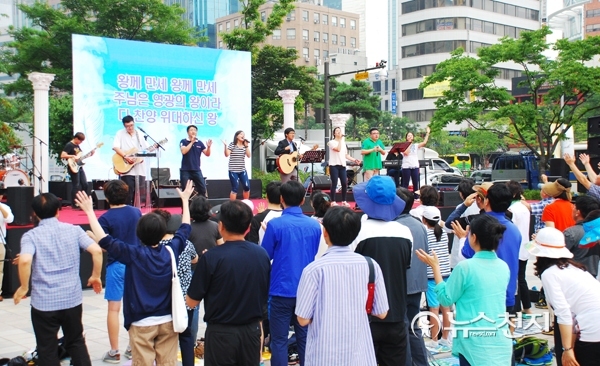 [천지일보=강수경 기자] 프란치스코 교황이 집전하는 ‘윤지충 바오로와 동료 순교자 123위’ 시복식이 16일 서울 광화문광장에서 열린 가운데 가톨릭을 반대하는 집회가 인근 청계천 한빛광장에서 열렸다. 당초 집회를 열지 않을 것으로 발표했던 ‘로마 가톨릭&교황 정체알리기 운동연대’가 이날 모임의 주축을 이뤘다. 이 단체는 모 단체가 도움을 요청해와 이날 함께 집회를 개최하게 됐다고 밝혔다. 참석자들이 찬양을 부르고 있다.