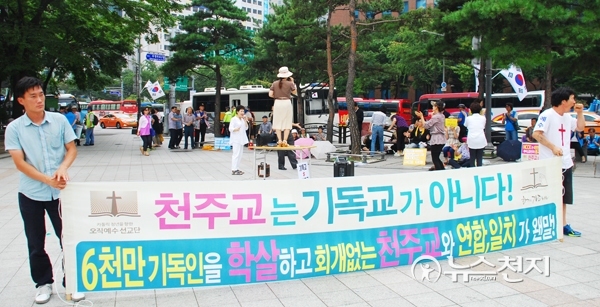 [천지일보=강수경 기자] 프란치스코 교황이 집전하는 ‘윤지충 바오로와 동료 순교자 123위’ 시복식이 16일 서울 광화문광장에서 열린 가운데 가톨릭을 반대하는 집회가 인근 종각역 보신각에서 열렸다. 이 집회는 ‘가톨릭 청년을 위한 오직예수선교단(대표 허베드로 목사, 단장 안천일 목사)’이 주최했다. 20여 명의 참석자들이 집회를 열고 있다.