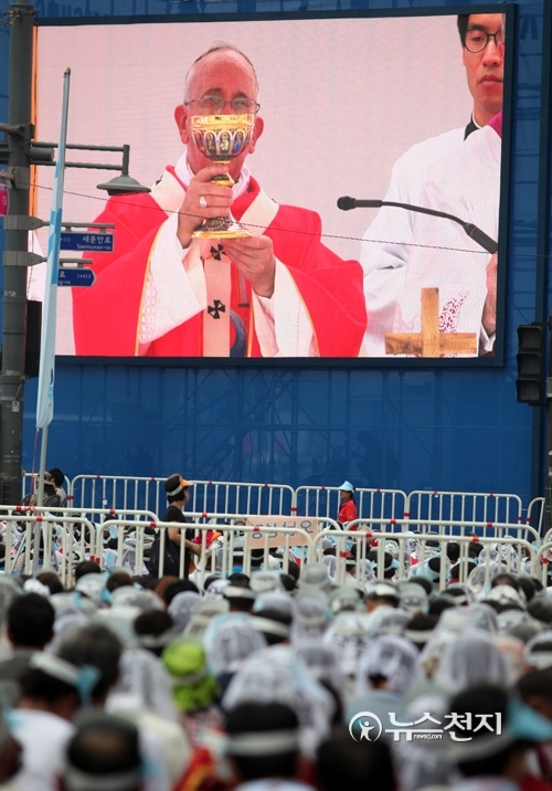 [천지일보=박준성 기자] 프란치스코 교황이 집전한 ‘윤지충 바오로와 동료 순교자 123위’ 시복식 미사가 16일 서울 광화문광장에서 진행되고 있는 가운데 100만 명의 신자 및 시민들이 운집했다. 이날 오전 10시에 시작한 시복식은 정오 12시 전에 마무리됐다. 시복식이 무사히 끝나자 경호에 진땀뺐던 경찰이 안도했다. 한편 같은 시간 개신교 일부 교인들이 가톨릭 반대집회를 인근 청계천 한빛광장에서 열었다.