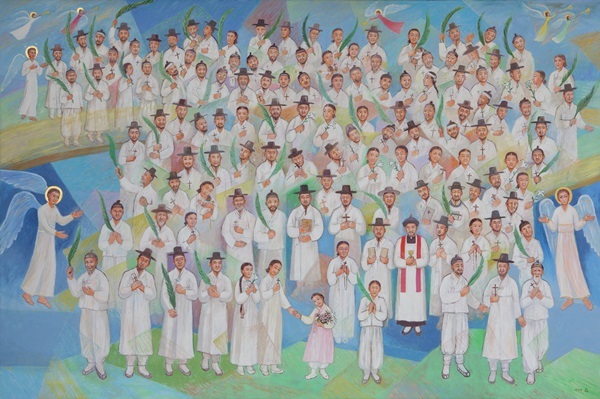 특히 유일한 성직자로, 한국 최초의 선교사인 복자 주문모(중국) 신부는 빨간 영대(목과 어깨에 걸쳐 가슴 쪽으로 길게 내려오도록 착용하는 띠)를 두르고 있어 쉽게 눈에 띈다. 또 12살에 순교한 가장 어린 복자 이봉금(아나스타시아)은 화동이 되어 무궁화꽃과 백합꽃으로 엮은 꽃다발을 들고 가장 앞에 서 있다.