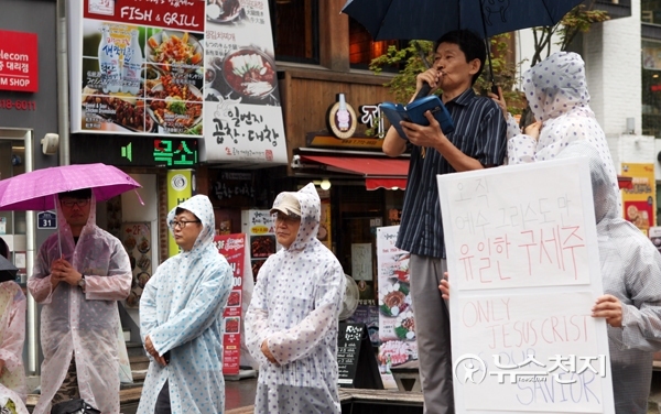 [천지일보=박준성 기자] 오직예수선교단이 18일 서울 명동성당 인근에서 가톨릭과 교황 제도를 반대하는 집회를 열었다. 이날 프란치스코 교황은 명동성당에서 방한 마지막날 일정인 ‘평화와 화해를 위한 미사’를 마치고 4박 5일의 일정을 마무리하고 바티칸으로 출국했다.