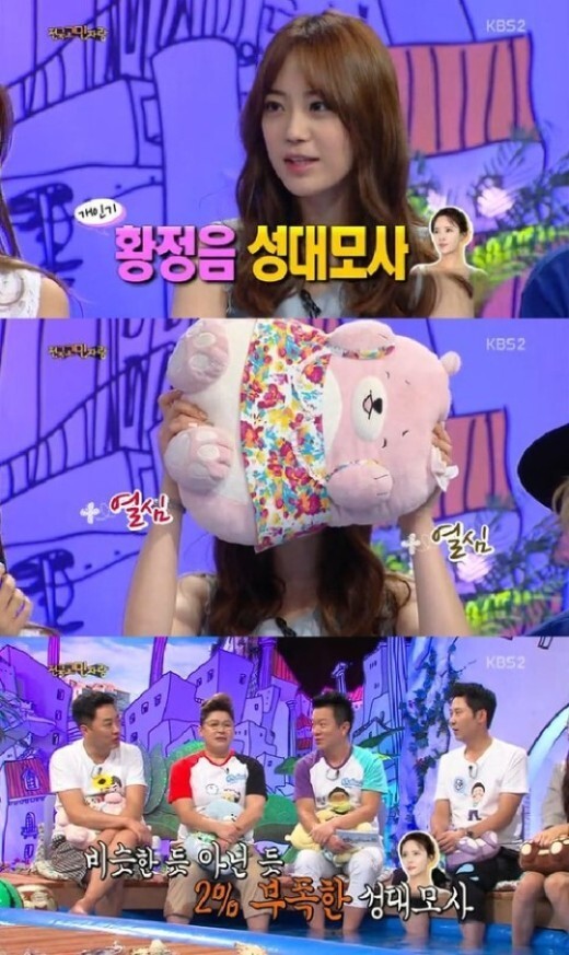 허영지는 “황정음 성대모사를 준비했다”며 핑크색 쿠션으로 얼굴을 가린 후 “아 진짜 어떡해~ 나 완전 어이없어”라고 열심히 성대모사를 했다.
