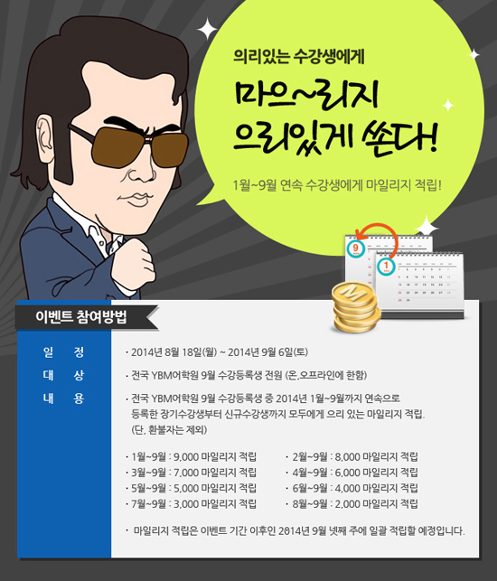 8월에 이어 9월에 연달아 수강 등록하는 학생에게는 현금처럼 바로 사용 가능한 마일리지 2000점이 적립된다. 뿐만 아니라 한 달 더 다녔을 경우 1개월 당 1000점씩 추가 적립 혜택을 누릴 수 있다. 1월부터 9월까지 꾸준히 수강 등록하면 최대 9000점까지 마일리지 적립이 가능하다. 마일리지는 9월 넷째 주에 일괄 적립된다.