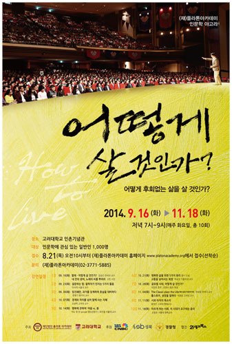 [천지일보=김민아 기자] 고려대학교(총장 김병철)와 재단법인 플라톤 아카데미가 공동 주최하는 인문학 대중강연 프로그램 ‘인문학 아고라, 어떻게 살 것인가’가 다음 달 16일부터 11월 18일까지 매주 화요일 오후 7시 고려대 인촌기념관에서 열린다.