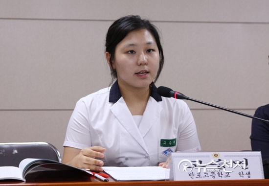 [천지일보=김민아 기자] 고승연(18, 반포고) 양이 20일 서울 중구 서울특별시의회별관에서 열린 ‘서울시민을 설득하라! 자사고·일반고 토론회’에서 발제를 하고 있다.
