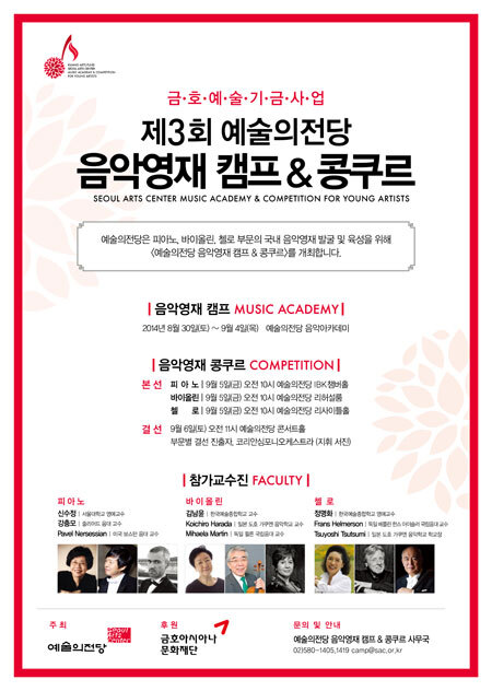 무료로 공개하는 예술의전당 음악영재 캠프&콩쿠르 결선 무대는 오는 9월 6일 오전 11시 예술의전당 콘서트홀에서 펼쳐진다. 무료관람 신청은 예술의전당 홈페이지와 금호아트홀 홈페이지에서 가능하다.