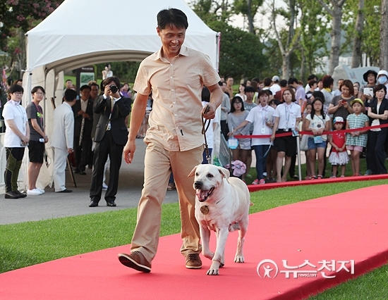 ▲ 21일 전남 순천시 순천만정원에서 진행된 제2회 순천만세계동물영화제에 영화 ‘마음이’의 주인공 달이가 레드카펫을 밟고 있다. ⓒ천지일보(뉴스천지)