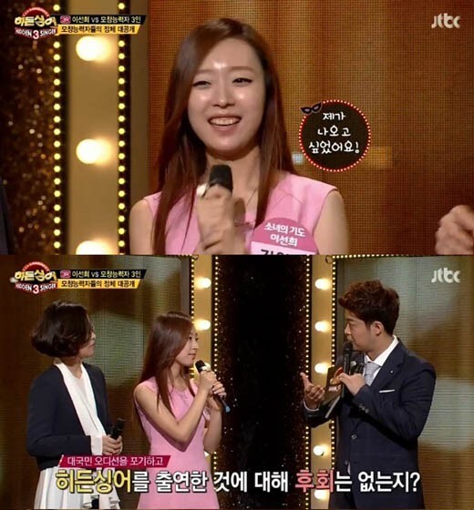 이어 그는 “가수가 꿈이라 Mnet ‘슈퍼스타K6’에서 ‘알고 싶어요’랑 ‘추억의 책장을 넘기면’을 불러 합격했다”며 “그런데 선생님을 만나는 게 더 중요해 그 오디션을 포기하고 과감히 이 자리에 오게 됐다”고 고백해 눈길을 끌었다.