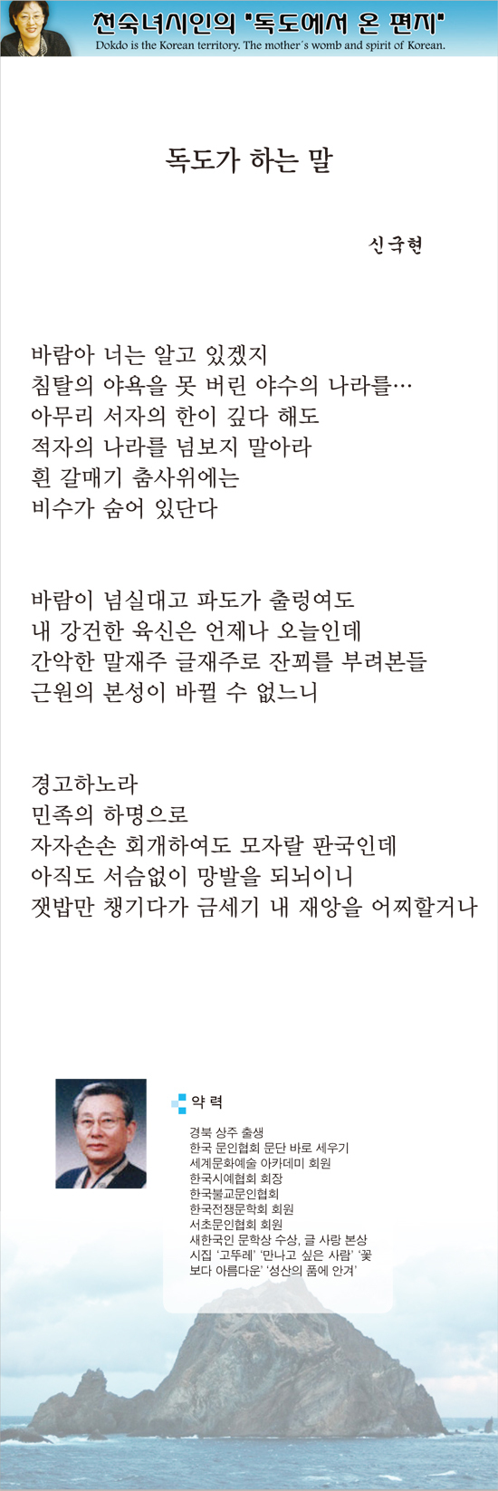 관련기사 [독도시] 독도는 피 흘리네 - 서재균 [독도시] 동해의 독도 - 이혜우 [독도시] 새말 휴게소에 독도가 있었다 - 장분선 [독도시] 호통 - 김백경 [독도시] 나의 집 독도 - 박수정 독도 근해서 구조된 北 어선ㆍ선원 3명 송환 [독도시] 화난 마음~ 갈앉히는 독도 - 천숙녀 [독도시] 차라리 구걸을 하라 - 이규양 [독도시] 독도는 역사다 - 김종길 [독도시] 독도는 본토 지킴이 - 김일영 [독도시] 독도 - 무애자 청학