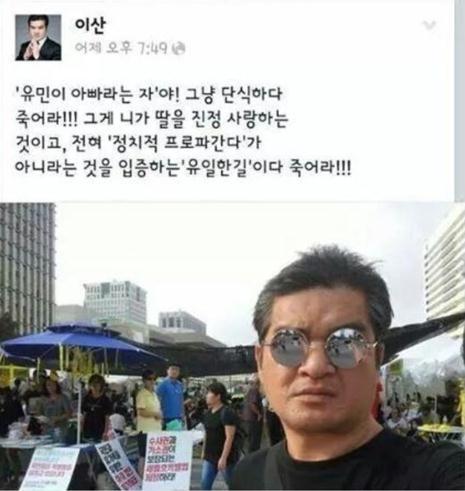지난 22일 이산은 자신의 트위터를 통해 “유민이 아빠라는 자야, 그냥 단식하다 죽어라. 그게 네가 딸을 진정 사랑하는 것이고, 전혀 ‘정치적 프로파간다’가 아니라는 것을 입증하는 유일한 길이다. 죽어라”라는 글을 게재했다.