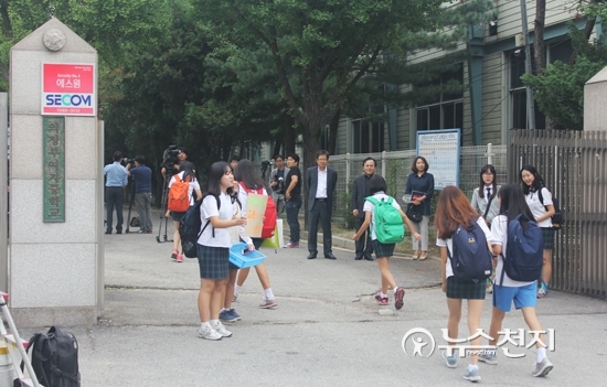 [천지일보=이혜림 기자] 25일 경기도 의정부시 가능동 의정부여자중학교가 9시 등교를 처음 시행한 가운데 학생들이 등교를 하고 있다.