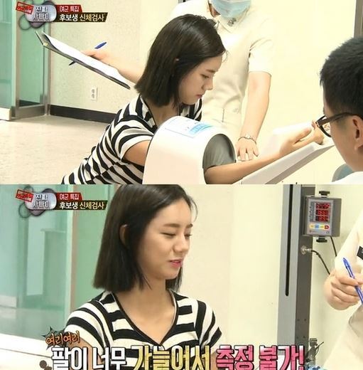 이날 멤버들을 대상으로 간단한 신체검사를 받던 중 혜리는 너무 팔이 가늘어 혈압 측정기가 조여지지 않아 결국 측정에 실패했다.
