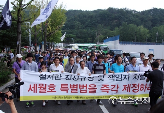 [천지일보=김민아 기자] 25일 서울 관악구 서울대 정문 앞에서 서울대 교수·학생·동문들이 세월호 특별법 제정을 촉구하는 행진을 시작하고 있다. 행진은 서울대-한강대교-용산-서울역을 거쳐 유가족들의 농성장이 있는 광화문 광장까지 14㎞ 가량 진행된다.
