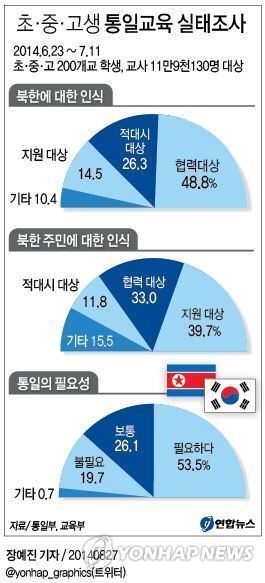 통일이 필요하다는 답변은 초등학교(71%)에서 가장 많이 나왔고 중학교(54.3%), 고등학교(47.8%) 등의 순이었다.