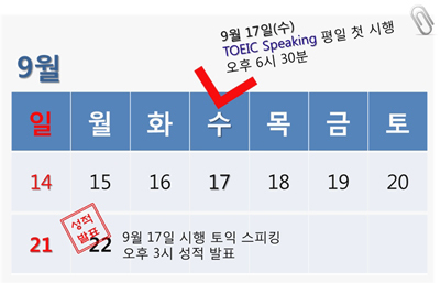 현재 토익 스피킹은 주로 주말인 토·일요일, 공휴일 등에 시행되고 있으나 오는 9월 초·중반에 집중된 기업들의 하반기 채용 일정에 맞춰 평일 시험을 도입했다는 게 한국토익위원회 측 설명이다.