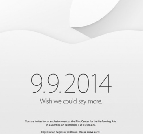 시넷 등 외신들에 따르면 애플은 28일(현지시각) 신제품 출시행사 초대장을 언론매체에 발송했다. 이 초대장에는 9.9.2014라는 날짜와 함께 ‘더 많은 것을 말할 수 있었으면 좋겠습니다(Wish we could say more)’라는 문구만이 적혀있을 뿐 제품에 대한 힌트는 없었다.