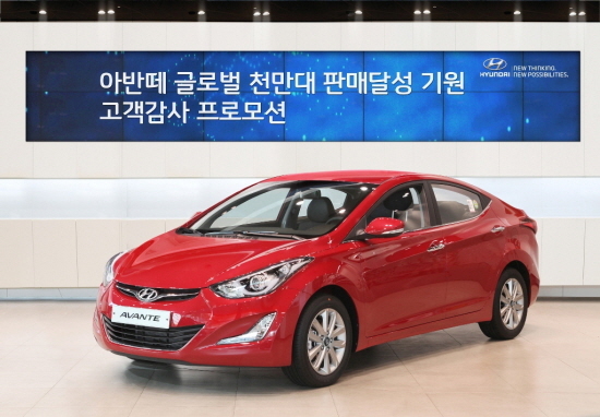 아반떼는 8월까지의 예상 실적치 기준으로 전 세계 누적판매 대수가 987만여 대로 집계되고 있어 1990년 10월 첫 출시 이후 24년만인 오는 10월 전 세계 1000만 대 판매 기록을 달성할 것으로 예상된다.