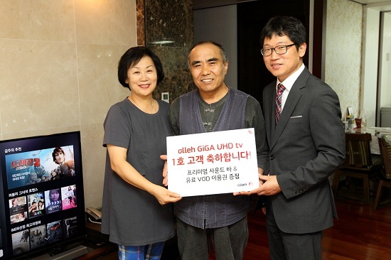 ‘올레 기가 UHD tv’ 1호 가입자는 김포에 거주하는 김기웅(60) 씨로, KT 미디어사업담당 전범석 상무가 1호 가입자에게 프리미엄 사운드바와 유료 콘텐츠 이용권을 직접 전달했다.