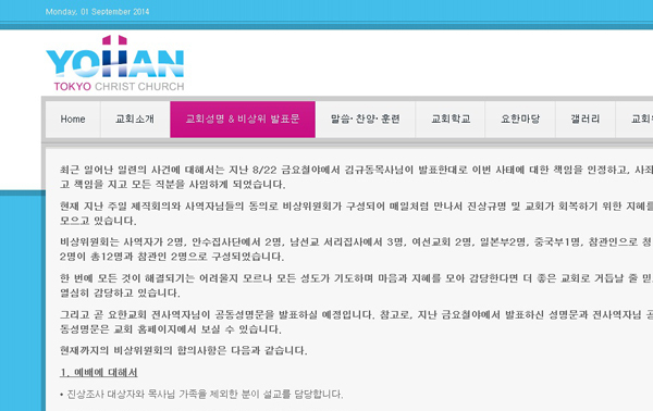 앞서 김 목사는 교인들에게 사과문을 발표하며 “교회 운영에 관한 일체의 사항들은 사역자들과 평신도들, 요한동경교회 가운데 중심으로 구성되는 비상대책위원회에 전적으로 일임하겠다”고 밝힌 바 있다. 이에 따라 교회는 사역자 2명, 안수집사 2명, 남선교 서리집사 3명, 여선교회 2명, 일본부 2명, 중국부 1명 등 비상위원회 12명을 구성했다. 참관인으로는 청년 2명이 참여한다. 조만간 요한교회 전사역자 명의의 공동성명문이 나올 예정이다.