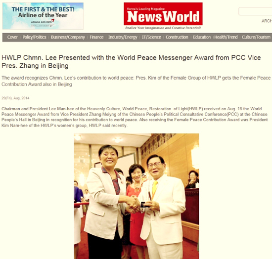 특히 이 대표와 하늘문화세계평화광복 산하 여성그룹 김남희 대표는 8월 16일 중국 북경 인민대회당 신문 발표청에서 장매영(張梅潁) 중국 전국정치협상회의 부주석으로부터 ‘세계평화 사자상’과 ‘여성평화 공헌상’을 각각 수상했다.