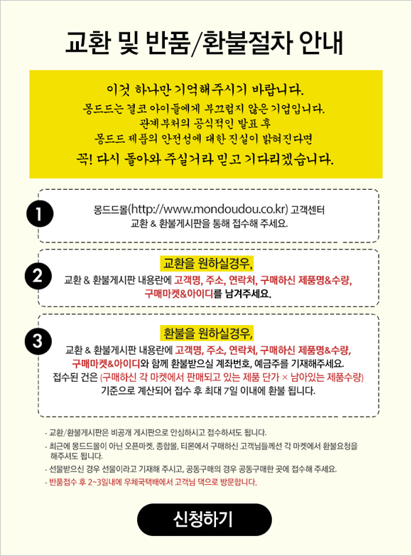 몽드드는 “논란이 되고 있는 성분의 유해성 진위여부를 떠나 구매하신 제품에 대한 환불을 원하신다면 마지막 고객 한 분까지 책임지고 우체국 택배를 통해 반품·회수조치를 진행하겠다”고 밝혔다.