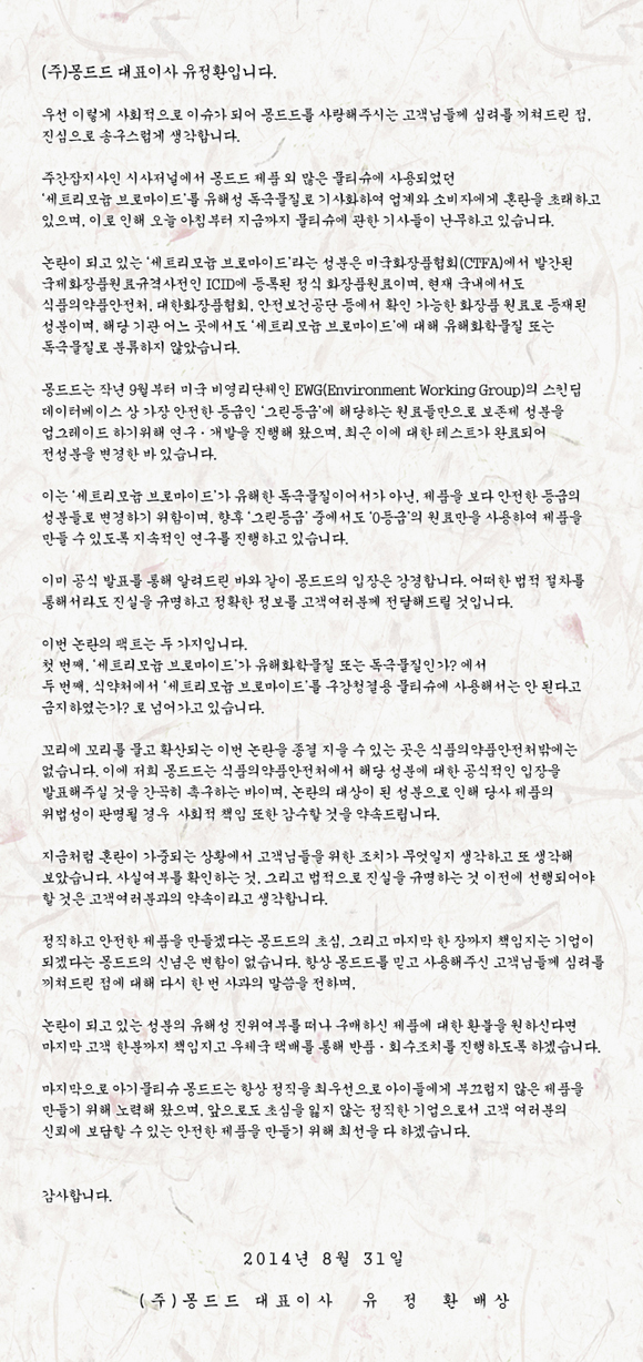 지난달 31일 몽드드는 공식 홈페이지를 통해 문제의 ‘세트리모늄 브로마이드’ 성분에 대해 “미국화장품협회(CTFA)에서 발간된 국제화장품원료규격사전인 ICID에 등록된 정식 화장품원료”라고 반박했다.