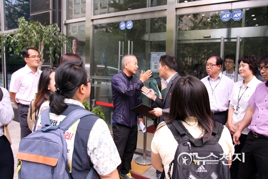 [천지일보=김민아 기자] 2일 인천 남동구 남월동 근로복지공단 경인지역본부 앞에서 본부장과의 면담을 두고 반올림 측과 근로복지공단 직원들이 대치하고 있다.