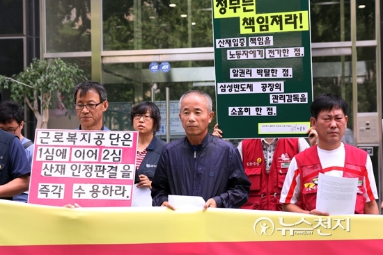 [천지일보=김민아 기자] 2일 인천 남동구 남월동 근로복지공단 경인지역본부 앞에서 반도체노동자의 건강과인권지킴이 반올림이 ‘삼성반도체 백혈병 항소심 산재인정 판결 수용을 촉구하는 기자회견’을 하고 있다. 가운데 故황유미 씨의 아버지 황상기 씨가 기자회견문을 들고 서 있다.