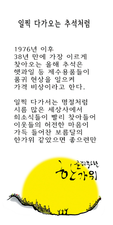 이전 기사보기 다음 기사보기 [시사카툰|천지풍경] 일찍 다가오는 추석처럼 바로가기 복사하기 본문 글씨 줄이기 본문 글씨 키우기 스크롤 이동 상태바 [시사카툰|천지풍경] 일찍 다가오는 추석처럼 천지풍경 입력 2014.09.02 17:52 기자명 천지일보 newscj@newscj.com 페이스북(으)로 기사보내기 트위터(으)로 기사보내기 카카오톡(으)로 기사보내기 텔레그램(으)로 기사보내기 URL복사(으)로 기사보내기 바로가기 기사스크랩하기 다른 공유 찾기 본문 글씨 줄이기 가 본문 글씨 키우기 이 기사를 공유합니다 페이스북(으)로 기사보내기 트위터(으)로 기사보내기 카카오톡(으)로 기사보내기 텔레그램(으)로 기사보내기 URL복사(으)로 기사보내기 닫기 글 정라곤 시인 | 그림 김진호 화백 천지일보는 24시간 여러분의 제보를 기다립니다. 천지일보 카톡 1644-7533 newscj@newscj.com 제보하기 천지일보 newscj@newscj.com 다른 기사 보기 관련기사 [시사카툰|천지풍경] 롯데의 ‘영원한 캡틴’ [시사카툰|천지풍경] 불현듯 잊고 지냈던 [시사카툰|천지풍경] 독도 땅값이 [시사카툰|천지풍경] 비정상의 금메달 [사설] 善良들이 국민 위해 일할 정기국회가 열렸다 [시사카툰|천지풍경] 오순도순 가족끼리 [시사카툰|천지풍경] 때로는 멍하니 [시사카툰|천지풍경] 담배값 인상 타령 [시사카툰|천지풍경] 자소서 대필시대 저작권자 © 천지일보 무단전재 및 재배포 금지 개의 댓글 삭제기준 회원로그인 작성자 비밀번호 댓글 내용입력 댓글 정렬 최신순 추천순 답글순 BEST댓글 BEST 댓글 답글과 추천수를 합산하여 자동으로 노출됩니다. 닫기 더보기 댓글삭제 삭제한 댓글은 다시 복구할 수 없습니다. 그래도 삭제하시겠습니까? 비밀번호 닫기 댓글수정 댓글 수정은 작성 후 1분내에만 가능합니다. 본문 / 400 비밀번호 닫기 내 댓글 모음 닫기