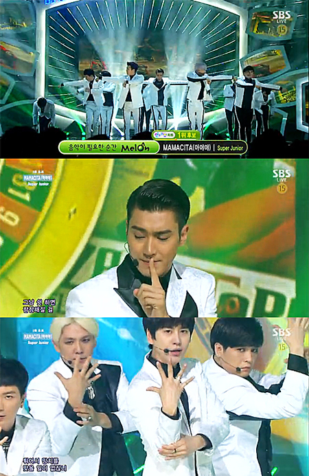 [천지일보=강은영 기자] 7일 오후 방송된 SBS 음악프로그램 ‘인기가요’에서는 그룹 슈퍼주니어가 타이틀곡 ‘마마시타(MAMACITA)’로 무대에 올랐다.