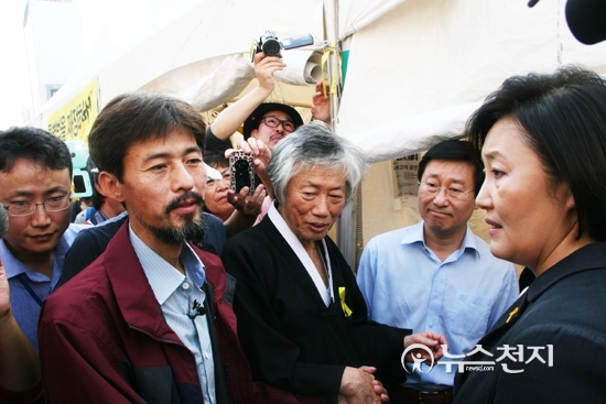 [천지일보=유영선 기자] ‘유민이 아빠’ 김영오 씨가 8일 서울 광화문광장에 마련된 세월호 특별법 제정 촉구 단식농성장에서 새정치민주연합 박영선 국민공감혁신위원장 겸 원내대표와 만나 이야기를 나누고 있다.