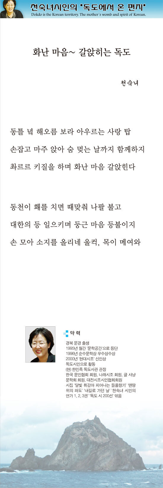 관련기사 [독도시] 독도가 하는 말 - 신국현 [독도시] 독도는 피 흘리네 - 서재균 [독도시] 동해의 독도 - 이혜우 [독도시] 새말 휴게소에 독도가 있었다 - 장분선 [독도시] 호통 - 김백경 [독도시] 차라리 구걸을 하라 - 이규양 [독도시] 독도는 역사다 - 김종길 [독도시] 독도는 본토 지킴이 - 김일영 [독도시] 독도 - 무애자 청학 [독도시] 독도 슈퍼마켓 - 이숙영