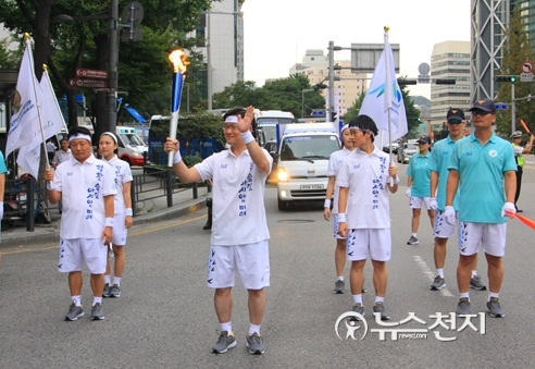 [천지일보=김현진 기자] 인천아시안게임 성화 봉송이 16일 서울에서 진행됐다.