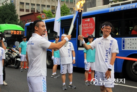 [천지일보=김현진 기자] 인천아시안게임 성화 봉송이 16일 서울에서 진행됐다.