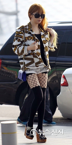 이날 박봄은 선글라스 및 골드패턴 재킷과 망사 레깅스의 파격적인 패션으로 공항 런웨이를 선보였다.