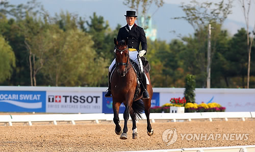 한국은 20일 오후 인천 드림파크 승마경기장에서 열린 2014 인천아시안게임 승마 마장마술 단체전에서 일본을 제치고 1위에 올랐다.